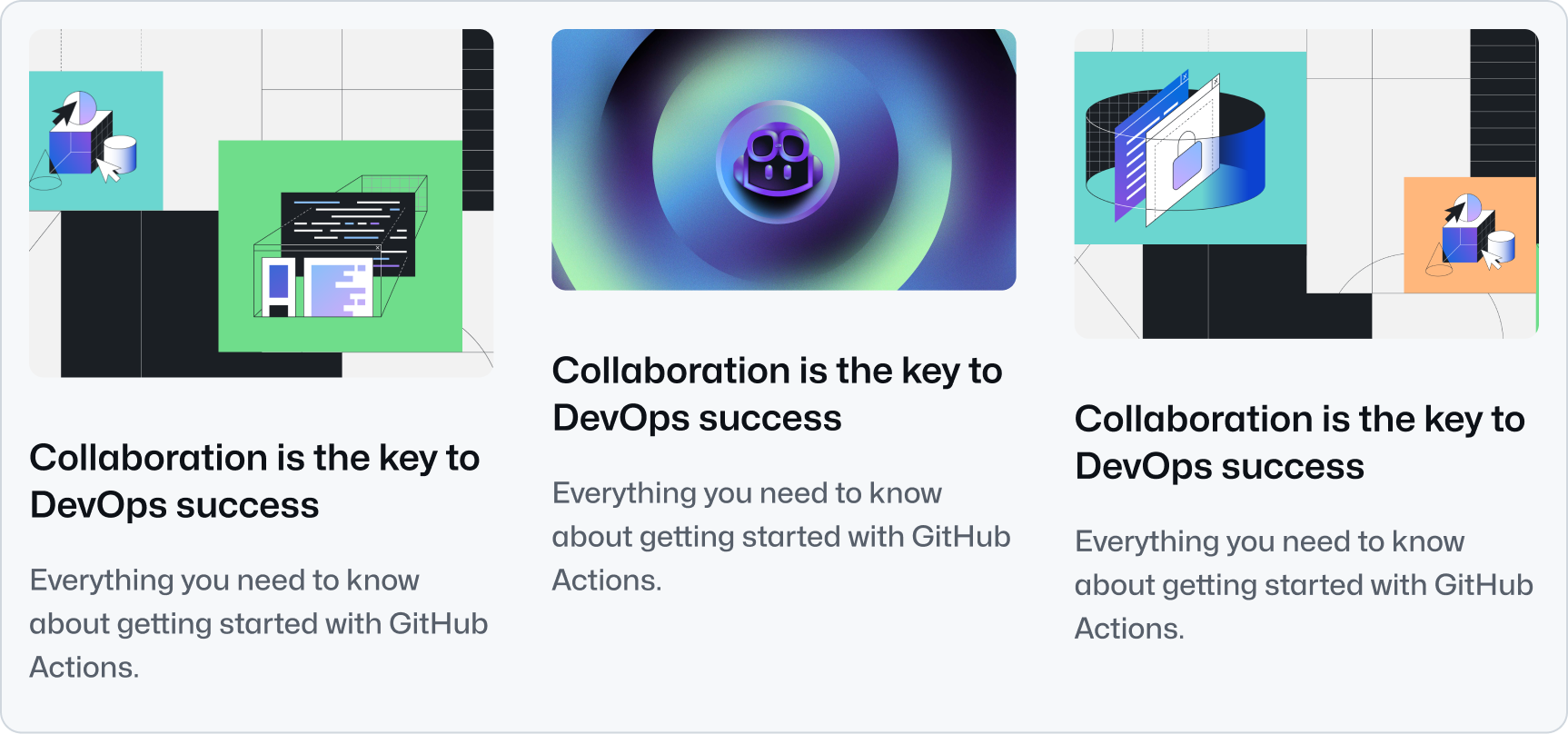 Cards should be used in small groups of three to five items, while Pillars can accommodate larger groups of up to nine items, or six if using images. The more items in a group, the less distinctive each individual element becomes.